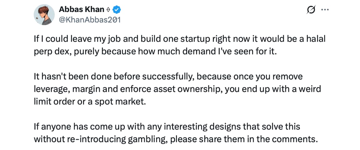 Crypto trader Abbas Khan proposed building a halal perpetual decentralized exchange after witnessing strong demand from Muslim users. Traditional perp DEXs like Hyperliquid use leverage, margin trading, and funding rates, all prohibited under Islamic law as riba, gharar, and maysir.